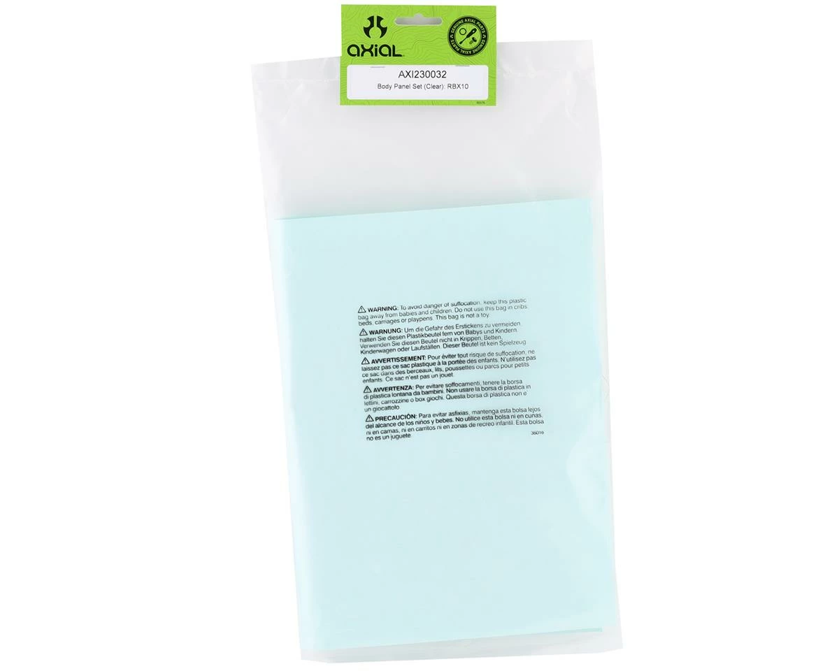 Axial RBX10 Ryft Body Panel Set. This is the optional clear body panel set. Package includes clear right and left side body panels, clear hood panel and decal sheet.