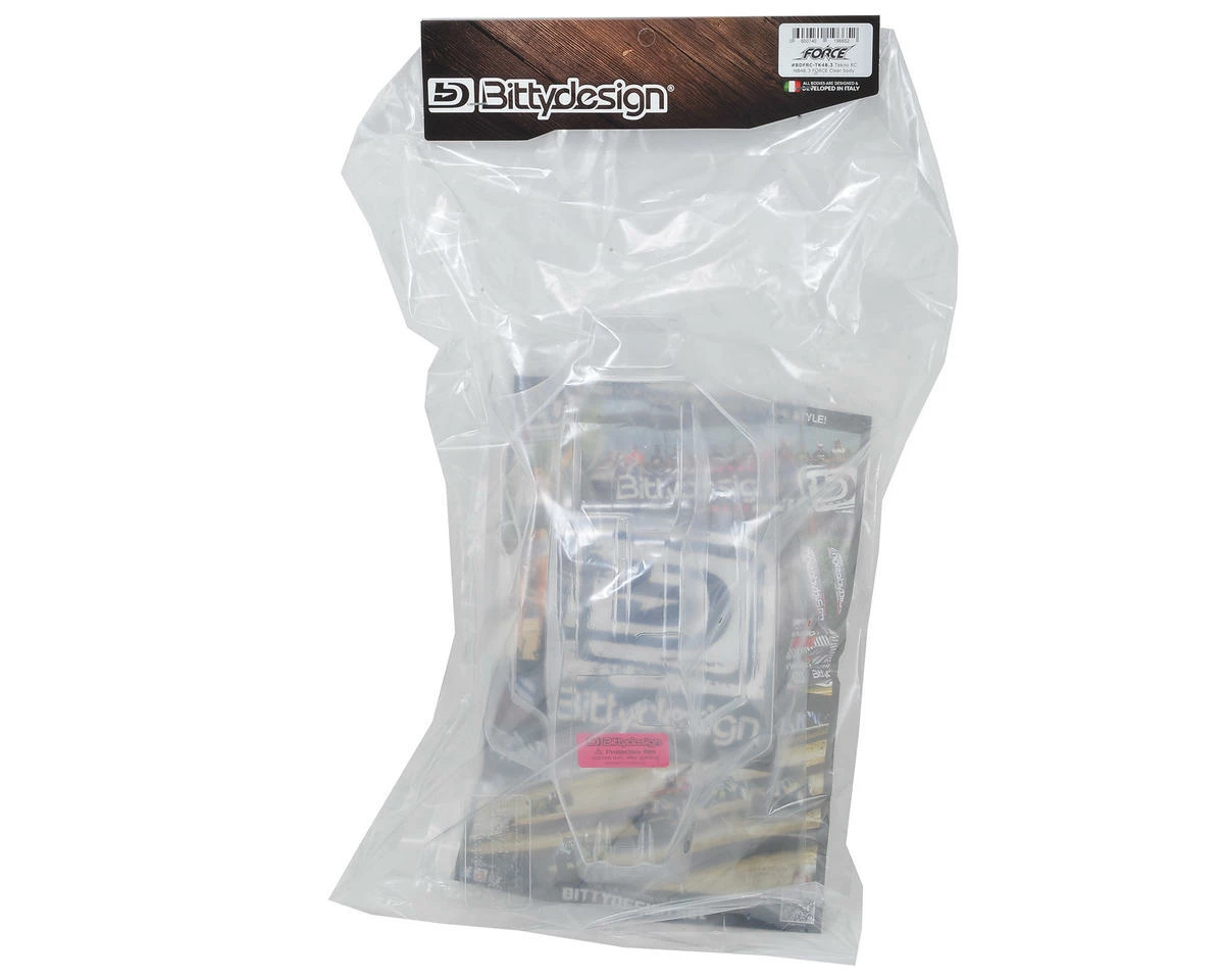 This is the Bittydesign “Force” Buggy Body for the Tekno NB48.3 and NB48.4 1/8 Nitro Buggies. This clear body requires polycarbonate paint and trimming before use. Package also includes window masks and decal sheet.