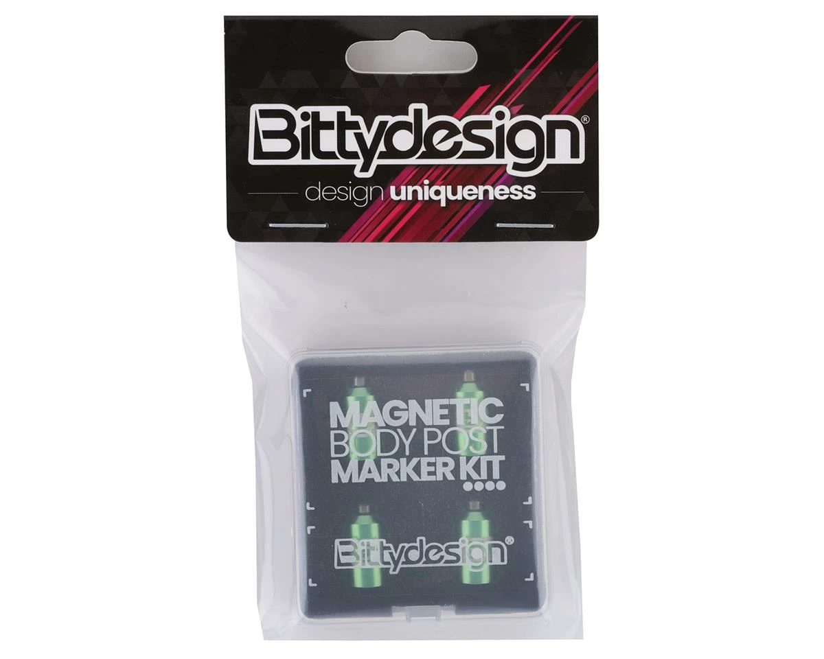 The Bittydesign Large Scale Magnetic Body Post Marker Kit is a great tool to help get your body post holes lined up perfectly. Anyone who has mounted a body – especially a painted body – knows how difficult it is to get the post holes lined up perfectly. This high powered magnet kit helps you find the position of the body posts, dramatically simplifying the hole marking process. The kit is optimized to be used on all the 1/8 to 1/5 scale size Off and On-Road cars and is a must have for enthusiasts that demand perfection.
