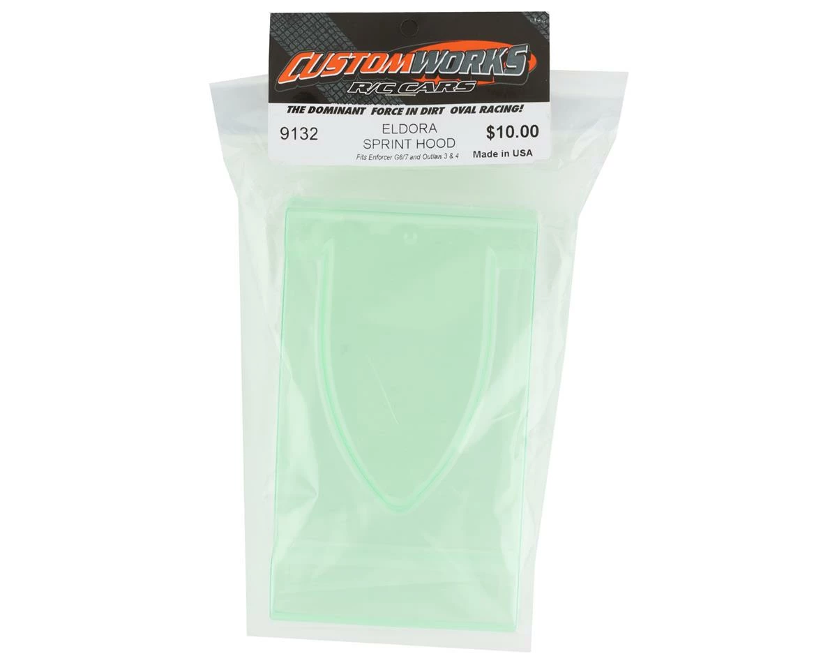 Custom Works Eldora Sprint Hood. This is a replacement hood intended for the Eldora Sprint Body Kit (CSW9130) used on the Outlaw 4 and Enforcer 7 vehicles. Package includes one clear Eldora sprint hood.