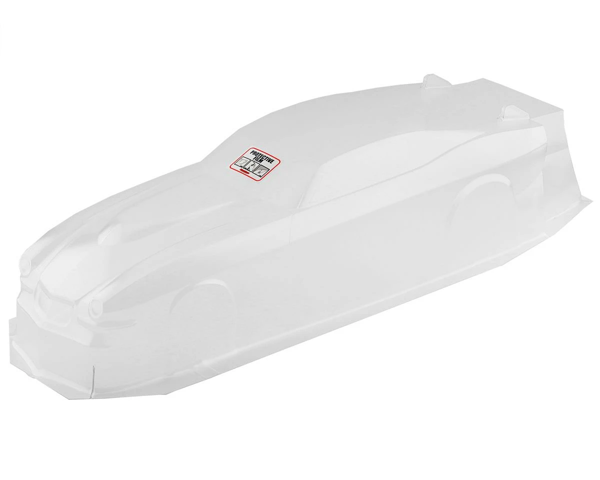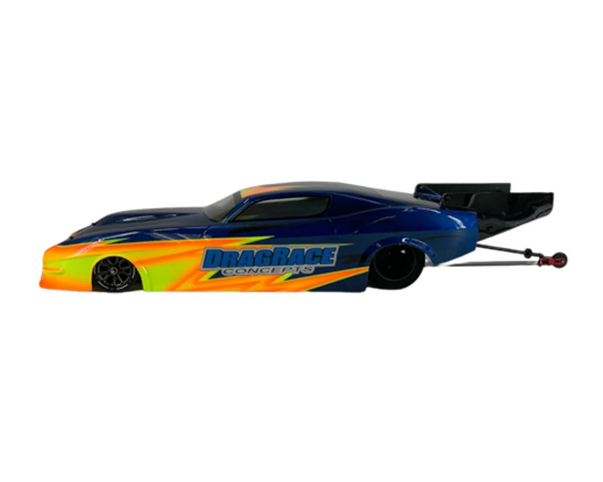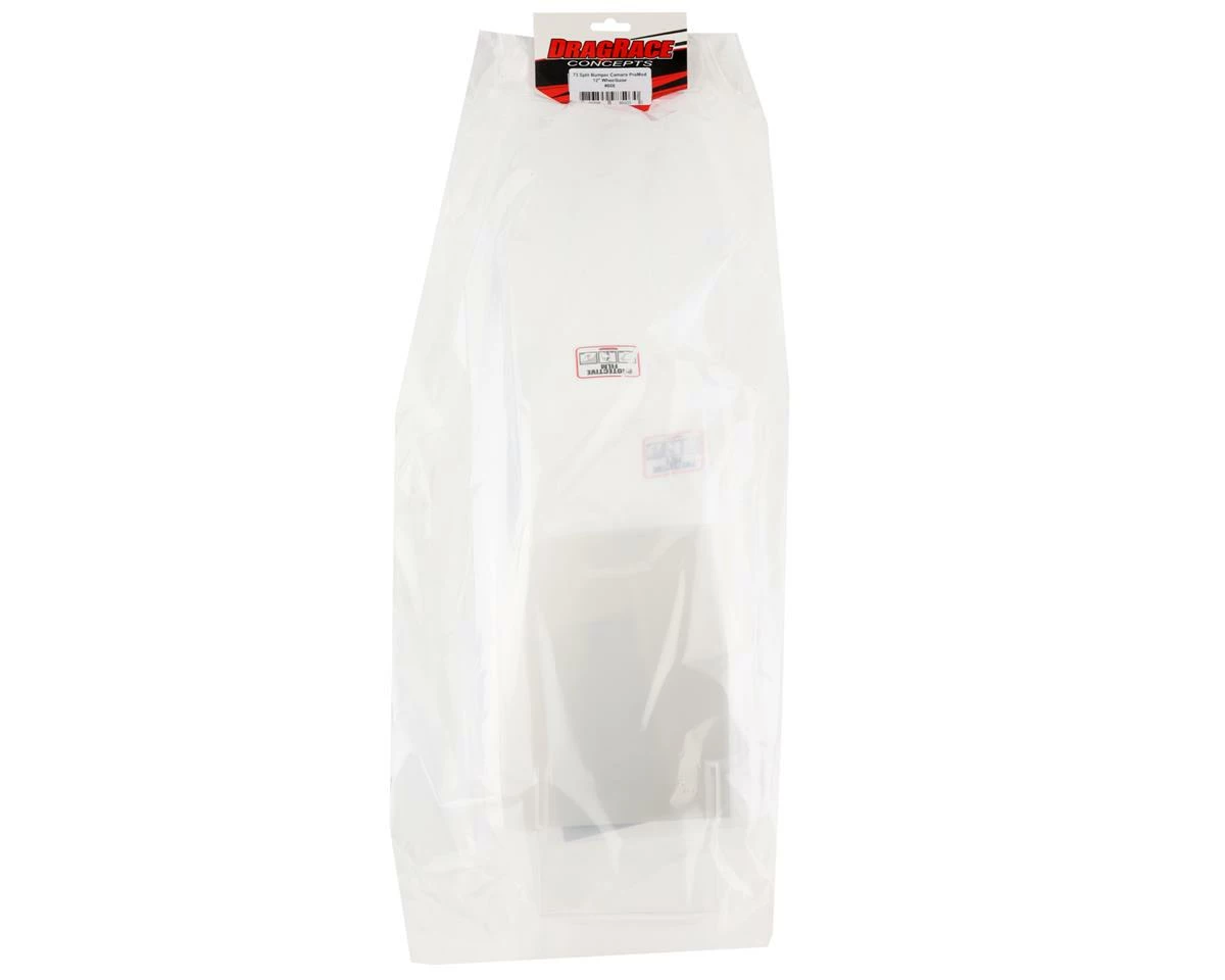 The DragRace Concepts 73 Split Bumper Camaro Pro Mod 1/10 Drag Racing Body features iconic muscle car styling blended with modern aerodynamics. This 12″ wheelbase body is molded in .030 lexan with factory applied protective film, and includes a lexan wing assembly, decals and window masks.