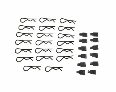 Duratrax 1/8 Body Clip Set with Rubber Pull Tabs. Package includes twenty Body Clips, and twelve Rubber Pull Tabs.