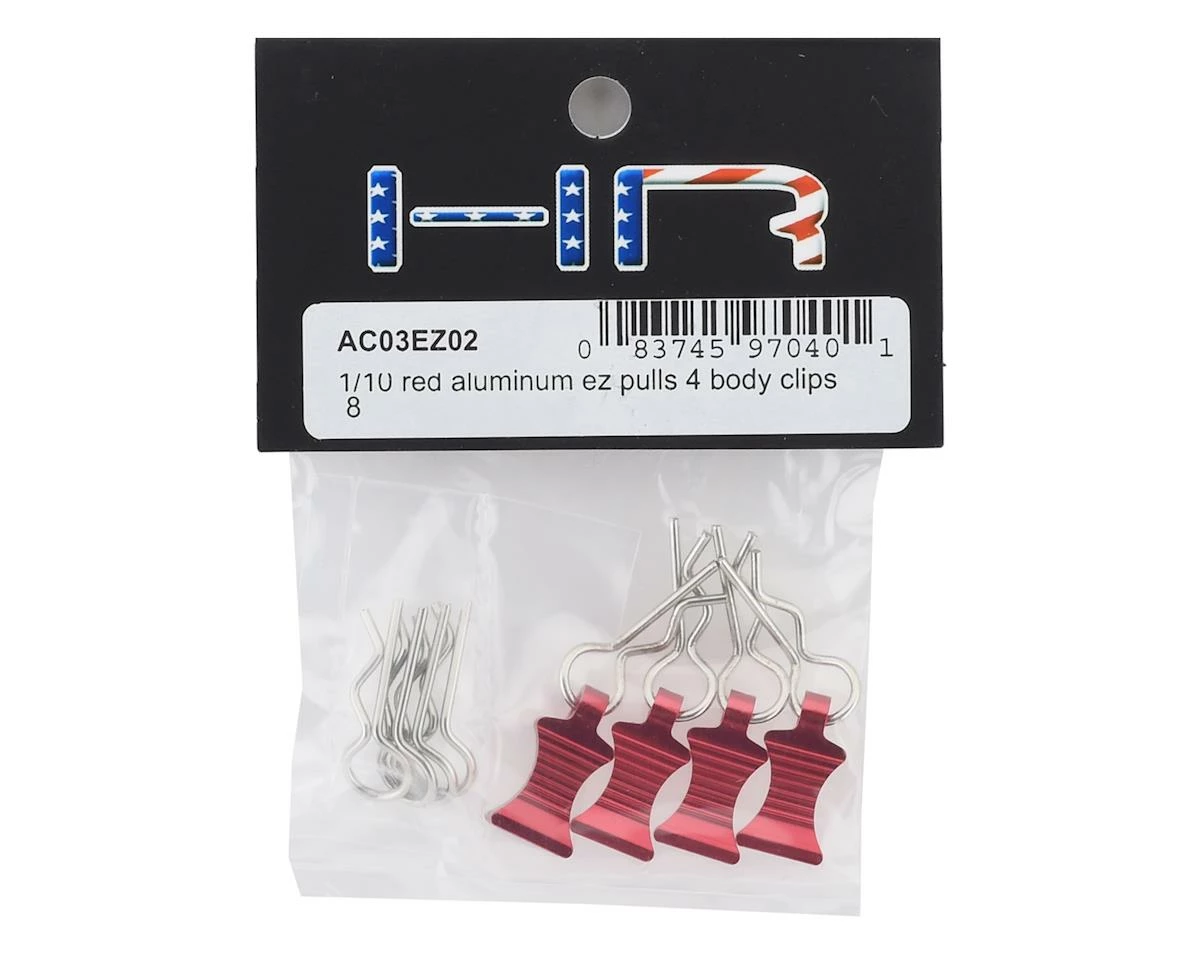 The Hot Racing 1/10 Aluminum EZ Pulls with Body Clips are an optional accessory for any 1/10 scale to upgrade the body clips and add a little pop of color. The pulls are CNC machined from durable Aluminum for lasting performance and anodized a variety of colors for added strength and style. Attach the pulls to the included body clips to minimize the fumbling and struggle of removing the body from the mounting posts.