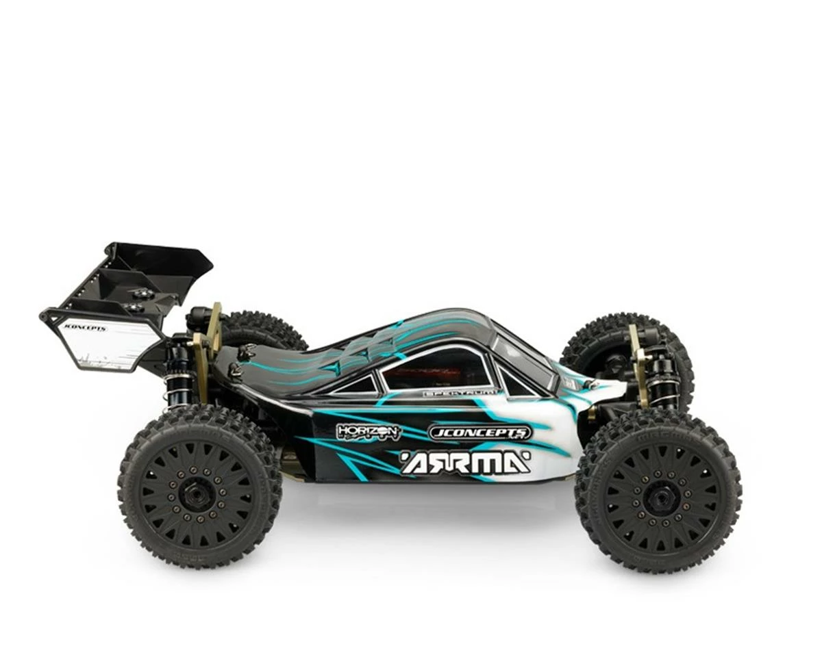 - Finished model is shown wearing the JConcepts pre-mounted JCO3060-3097 (black wheel) Magma tires on Cheetah wheels (JCO3395) along with 0128B Finnisher rear wing.