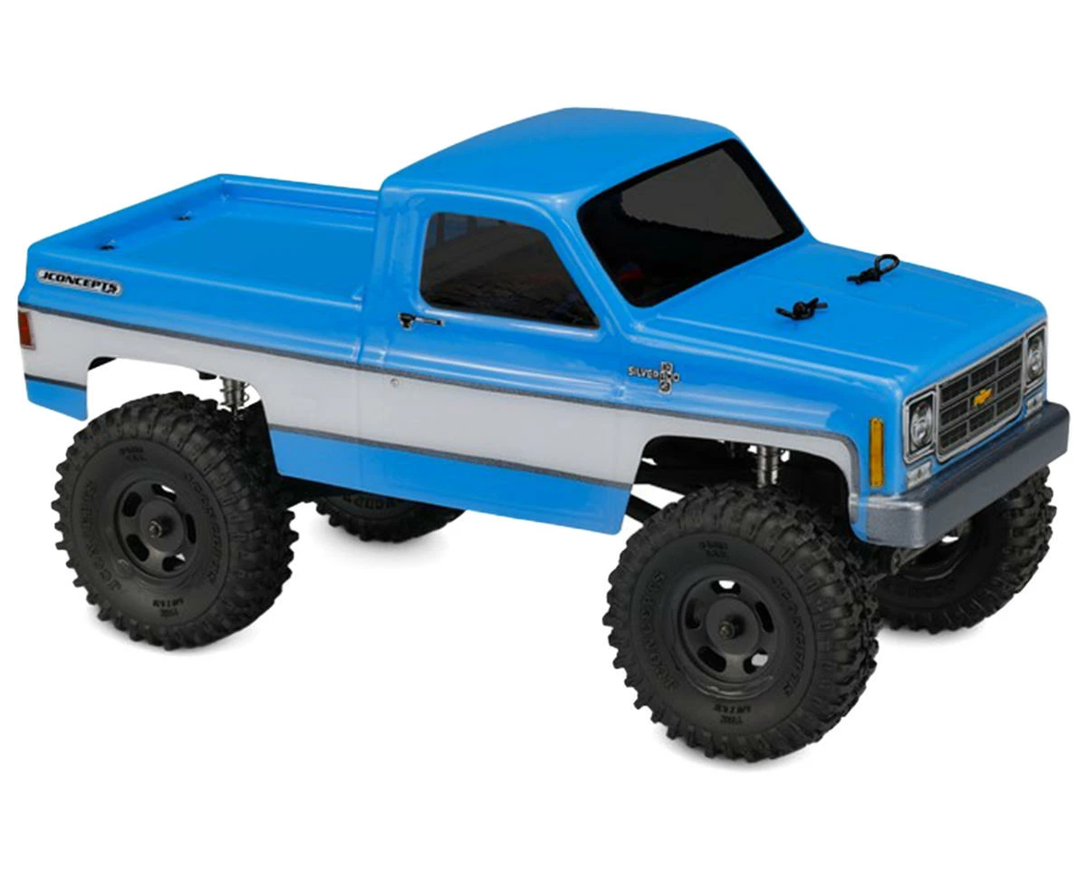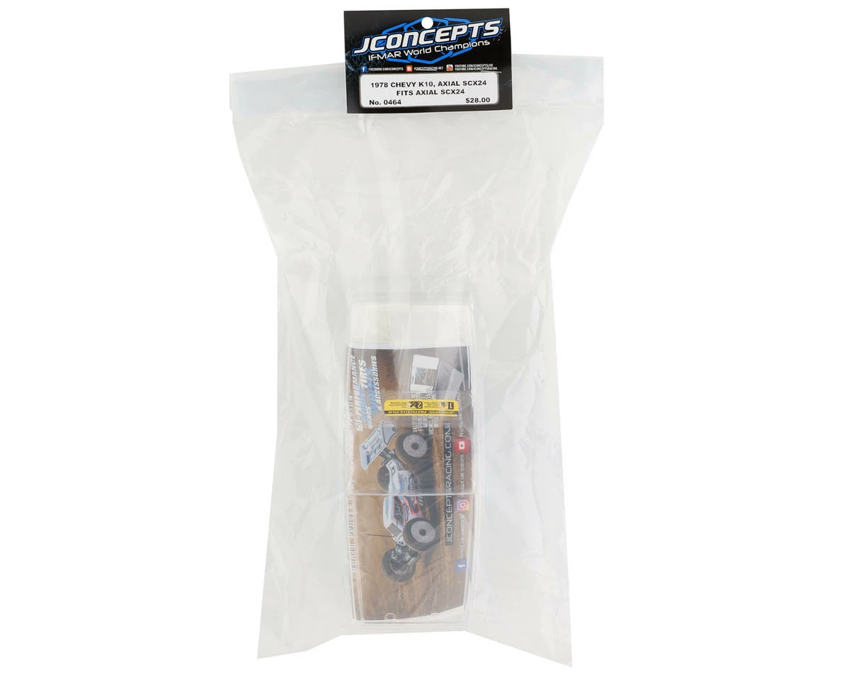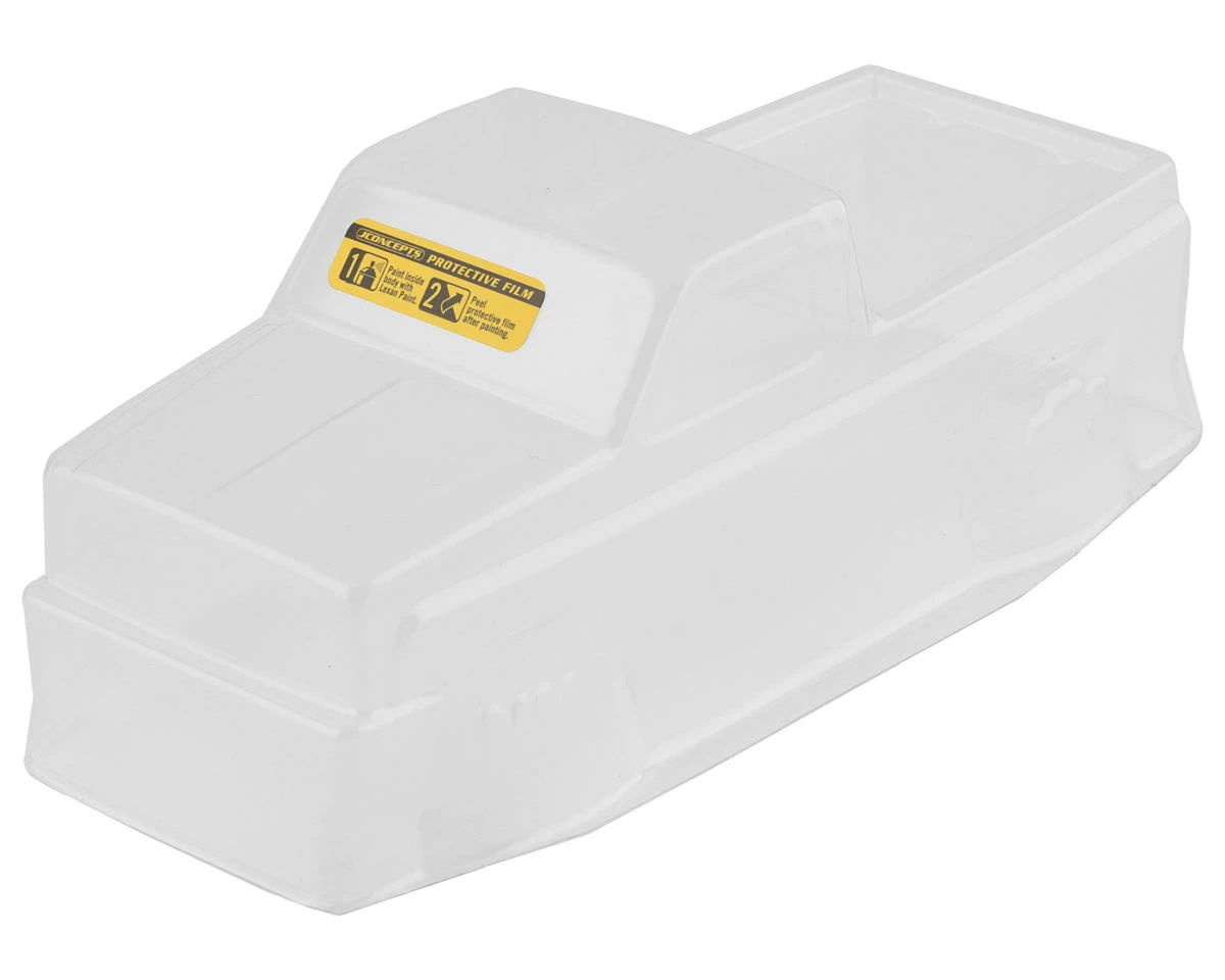 This is the JConcepts Axial SCX24 1978 Chevy K10 Mini Crawler Clear Body. This square-body K10 option was designed to fit 1/24 vehicles such as the Axial SCX24. This classic body features chiseled front end body lines, vertical turn signal markers, and a slight dovetailed rear section to give you a little extra clearance on the trail. The square body generation spanned an incredible 14 years and with small changes to grille, headlights, and trim packages throughout the years, JConcepts has added a bonus to the included decal sheet. An incredible five different grille options are included on the sheet giving the user the option of their favorite square body grille and trim package. Four light and two light bezel setups are included which contain bar and tube grille combinations. In addition, a plethora of badges are offered on the sheet featuring Sierra Grande, Custom Deluxe, Cheyenne, Scottsdale, and Silverado combinations.