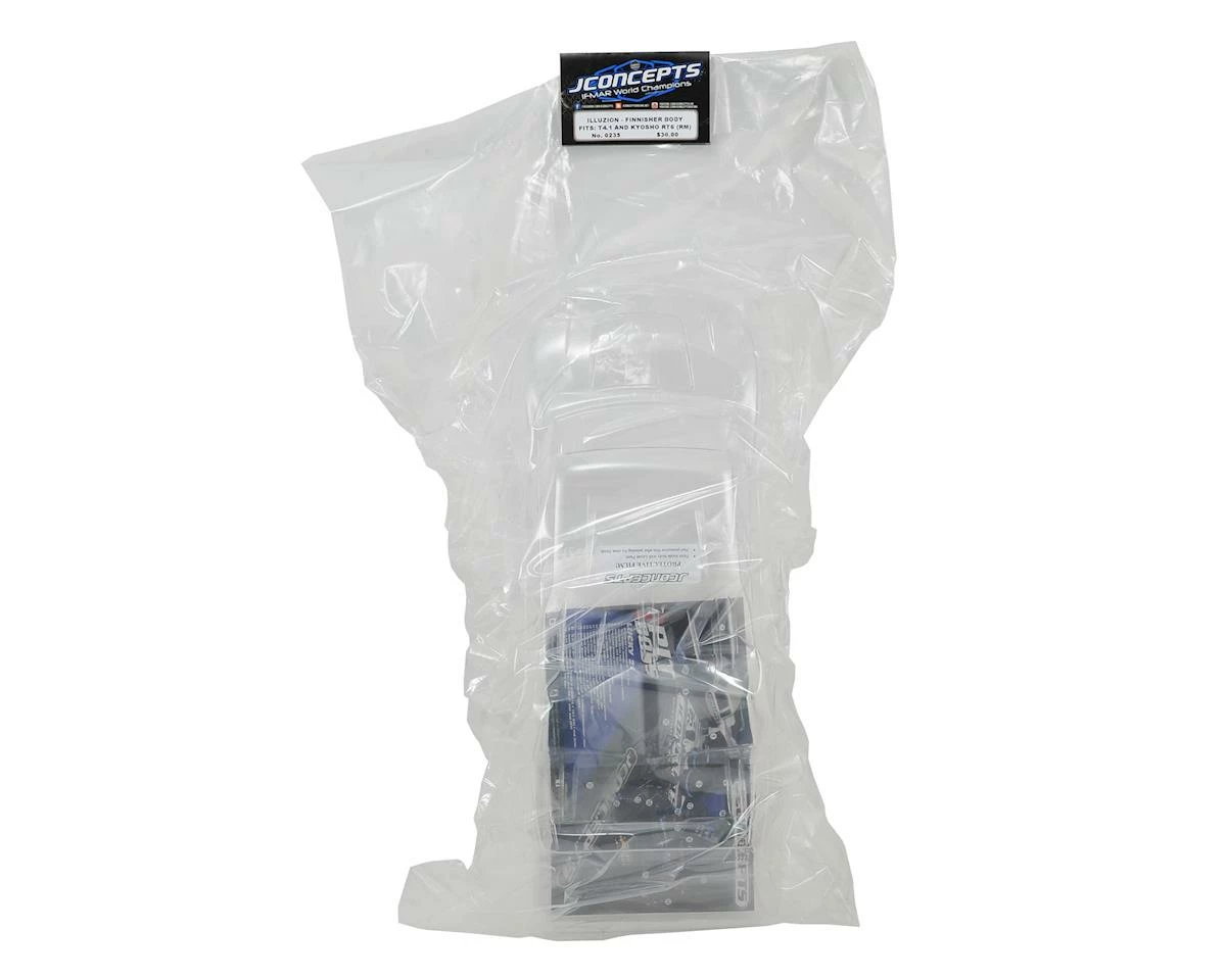 JConcepts accommodates a great truck with the release of the Finnisher body for the T4.3 Qualifier Series vehicle by Team Associated. The JCO0235 body has been updated to include pre-dimpled locations for one of the hottest RTR trucks on the circuit. The slight cab forward, raked windshield and aggressive stance highlight a performance oriented core. A revised front hood scoop allows plenty of clearance for the unique geometry while smoothing out the front down force area. Front chin spoiler, headlight and grill protect the front-end from unwanted up-drafts during flight while the supplied decals stand-out like an 18 wheeler.