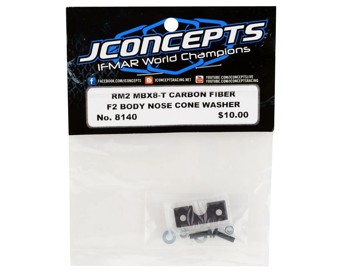 JConcepts RM2 MBX8T Carbon Fiber F2 Truck Body Nosepiece Washer. This optional nosepiece washer is designed to protect the front of your Mugen MBX8T. Made from carbon fiber, this washer includes the mounting hardware needed for installation. Package includes one nosepiece washer with hardware.