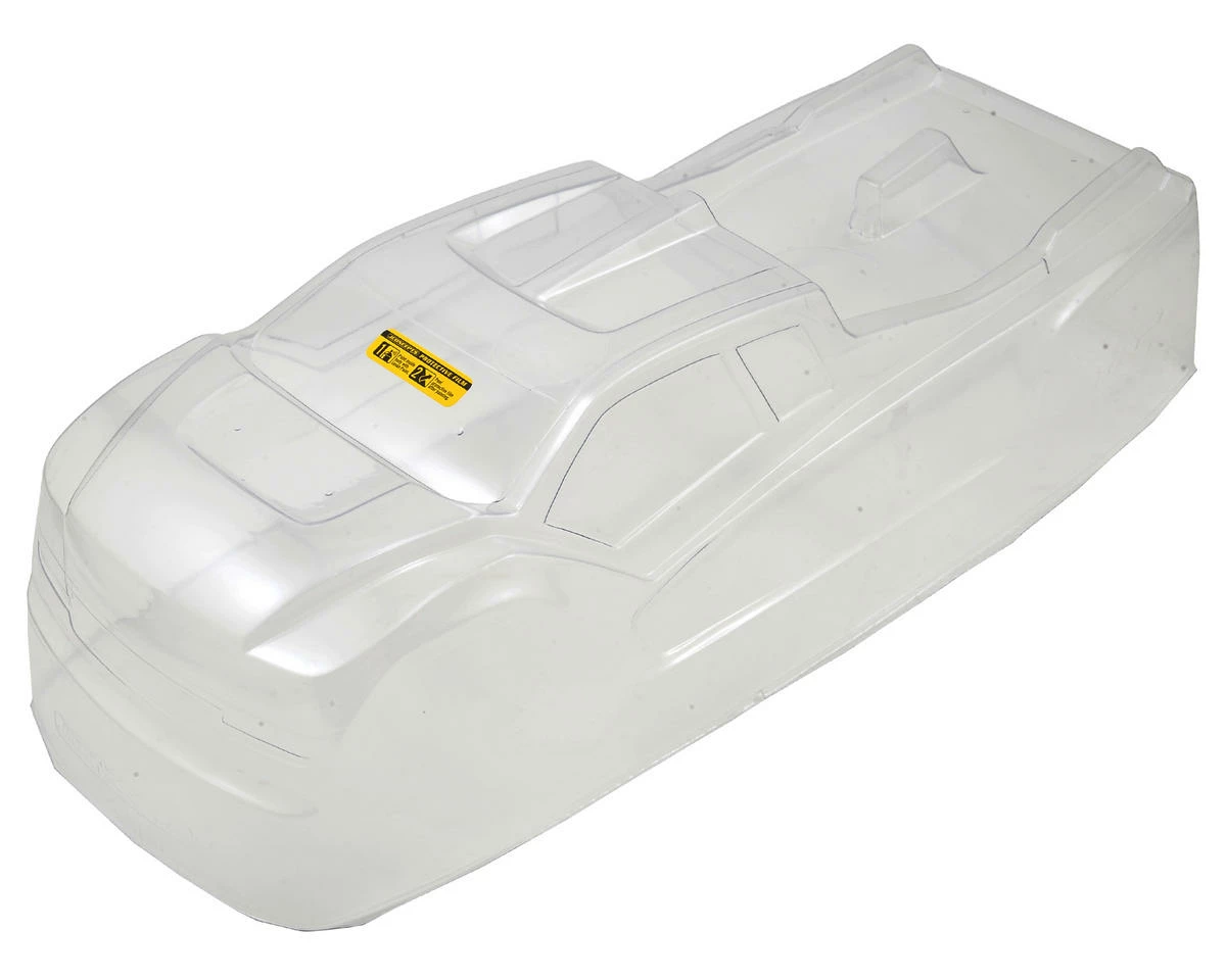 The body incorporates pre-dimpled locations for one of the hottest truggies on the market. The slight cab forward, raked windshield and aggressive stance highlight a performance oriented core. A wide front hood scoop allows plenty of clearance for the unique 8ight-T 4.0 shock geometry. The body incorporates a large center fin which begins on the roof line and finishes just past the half-way point on the bed. Extended front chin spoiler, headlight and grill protect the front-end from unwanted up-drafts during flight while the supplied decals stand-out like an 18 wheeler.