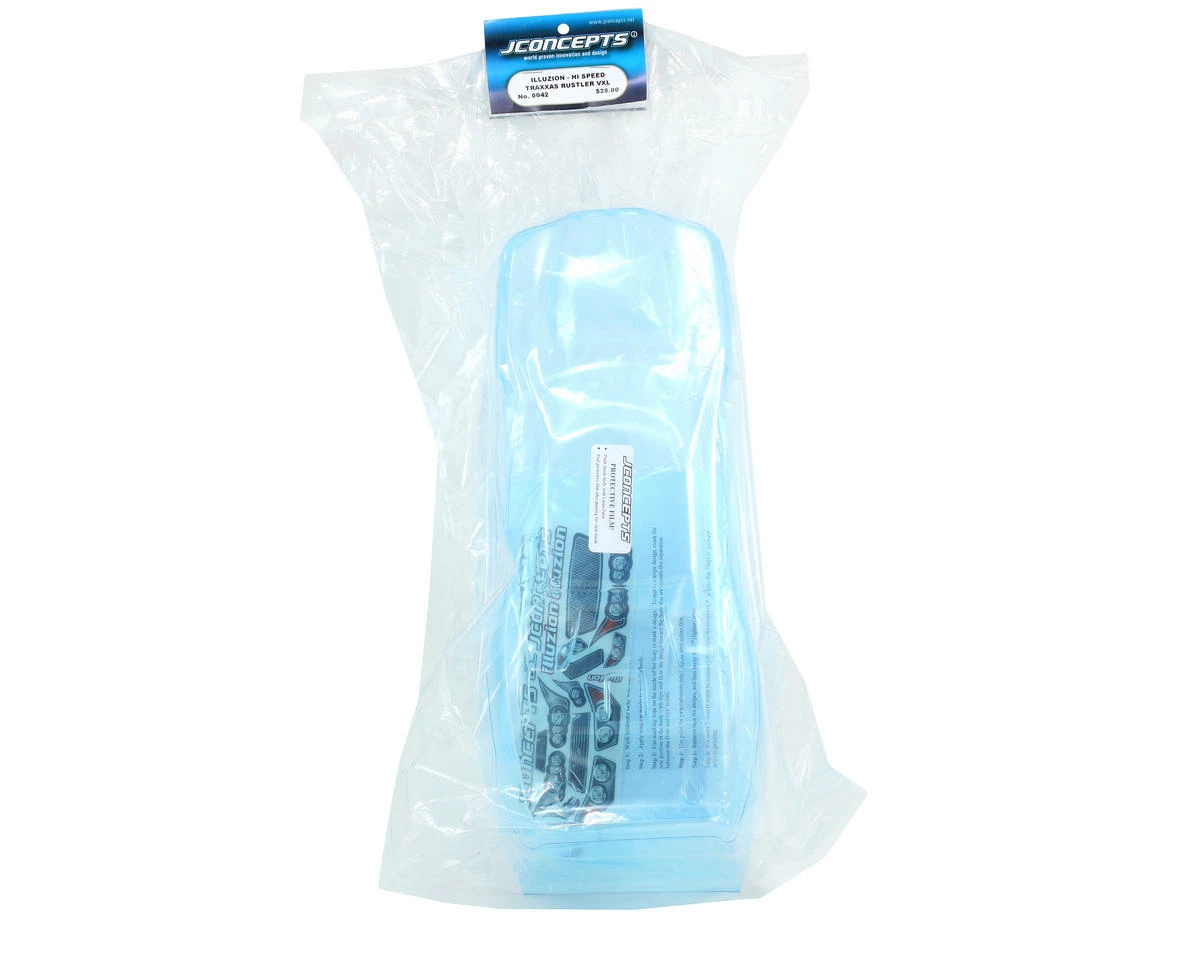 The “Hi-Speed” style is the latest in design for the Traxxas Rustler VXL truck by JConcepts. The Illuzion “Hi-Speed” styling presents a flowing design while incorporating many radical outlets and coves for additional air flow for electrical cooling. The Illuzion – “Hi-Speed” body is also the first to include a separate rear wing with side dams that attaches to the rear of the truck bed for superior fit and finish. Race inspired aggressive styling, Illuzionized cab and cove hood scoop combined with a durable flowing bed design are just some of the features that make the new Illuzion “Hi-Speed” body stand out from the rest.