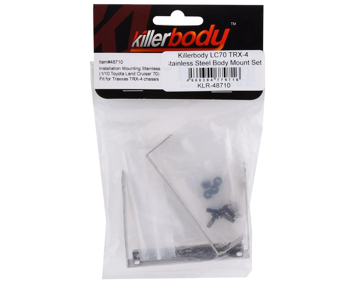 Killerbody Traxxas TRX-4 LC70 Stainless Steel Body Mount Set. This body mount set is used to mount the Killerbody LC70 Body Set (KLR-48601) to the Traxxas TRX-4. Package includes two body mounts with hardware.