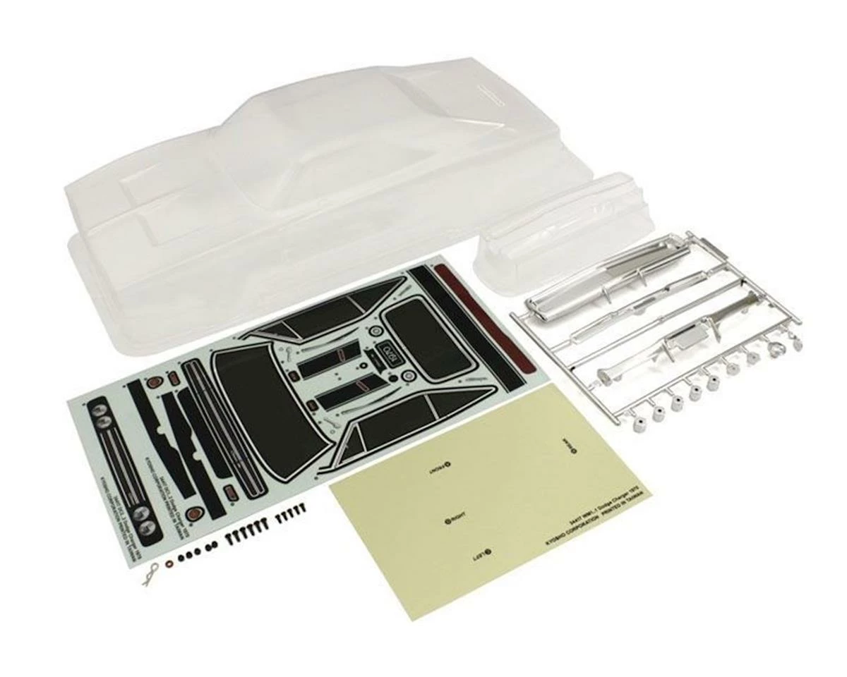 The Kyosho 1970 Dodge Charger Touring Car Body is a clear body option for the Kyosho Fazer Mk.2 FZ02L chassis, as well as other 200mm touring car platforms with a 275mm wheelbase. Package includes clear body, window masks, body trim decals, and body accessories.