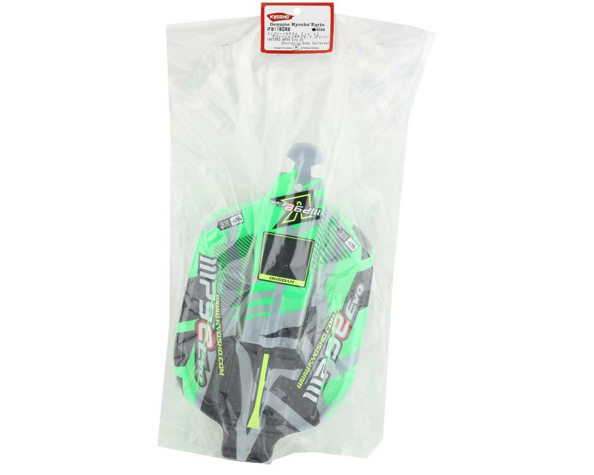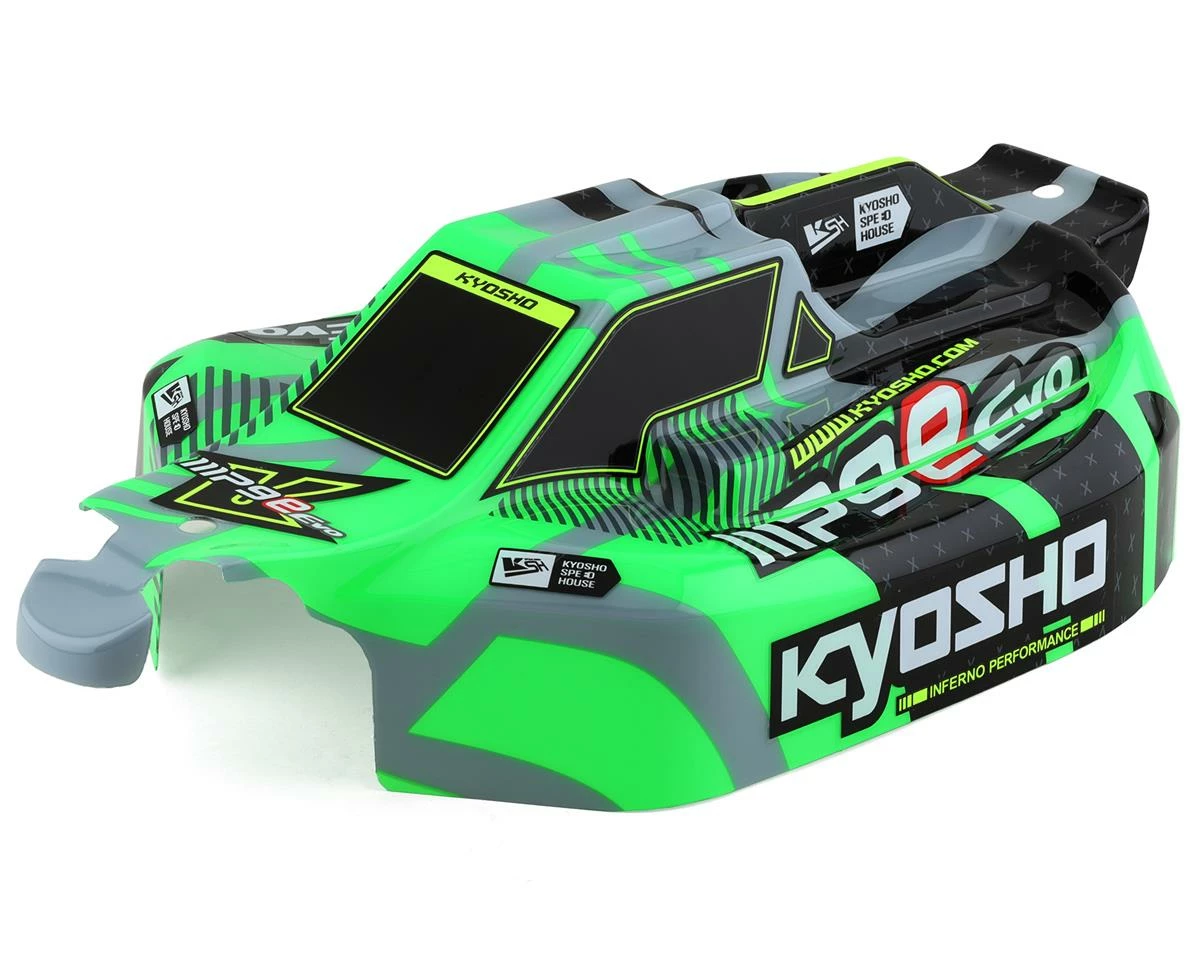 Kyosho MP9e EVO V2 Pre-Painted Lexan Body. This is a replacement body intended for the Kyosho MP9e EVO V2 buggy. This body comes Pre-Painted in a stylish paint scheme and is is Pre-Cut and ready to install. Package includes one Pre-Painted MP9e EVO V2 body in green and decal set.