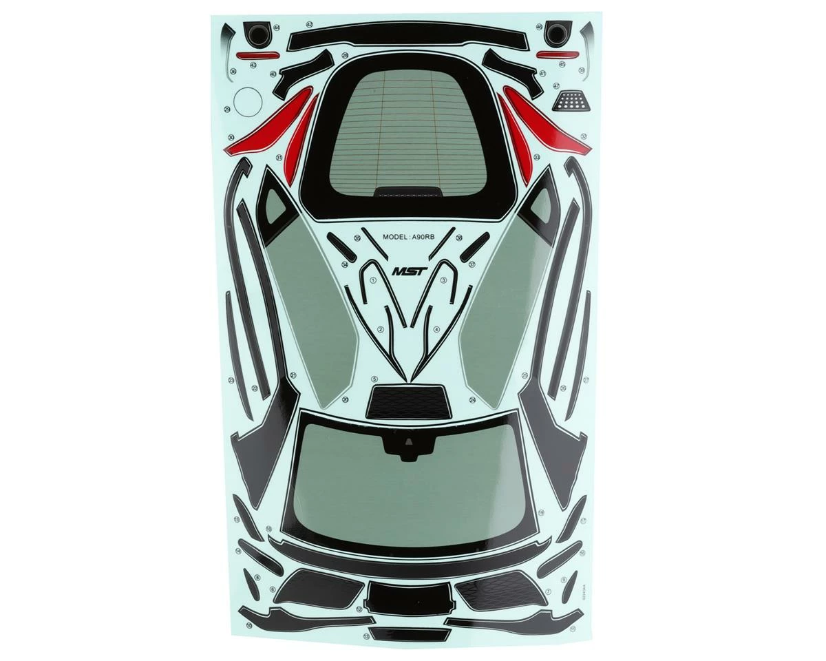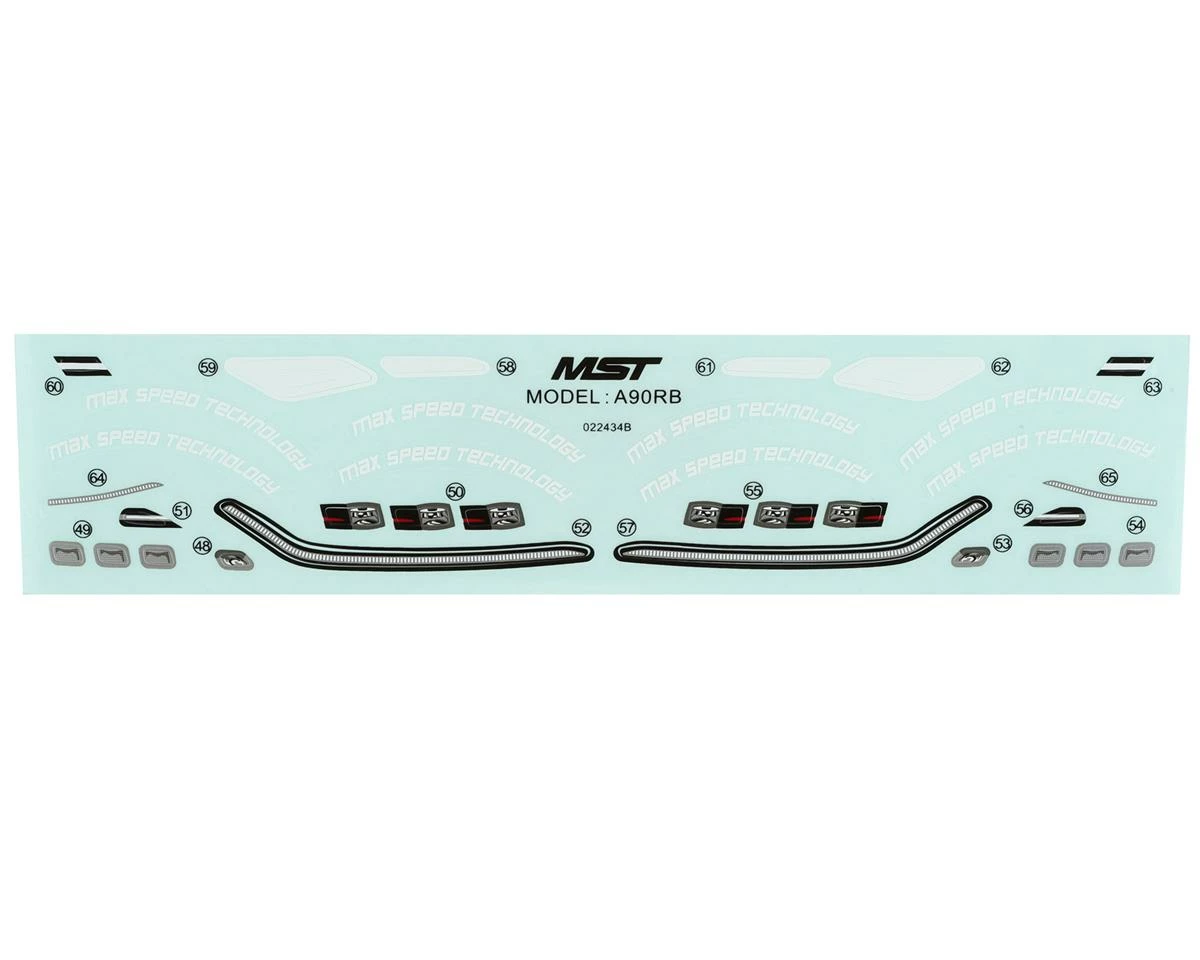 MST A90RB Drift Body. This clear body is a great option for a sporty drift body that is designed to fit 190mm width and 257mm wheelbase chassis. The body is made from durable polycarbonate and includes clear light buckets, as well as molded detail pieces. Package includes one body set one decal sheet and one window mask sheet.