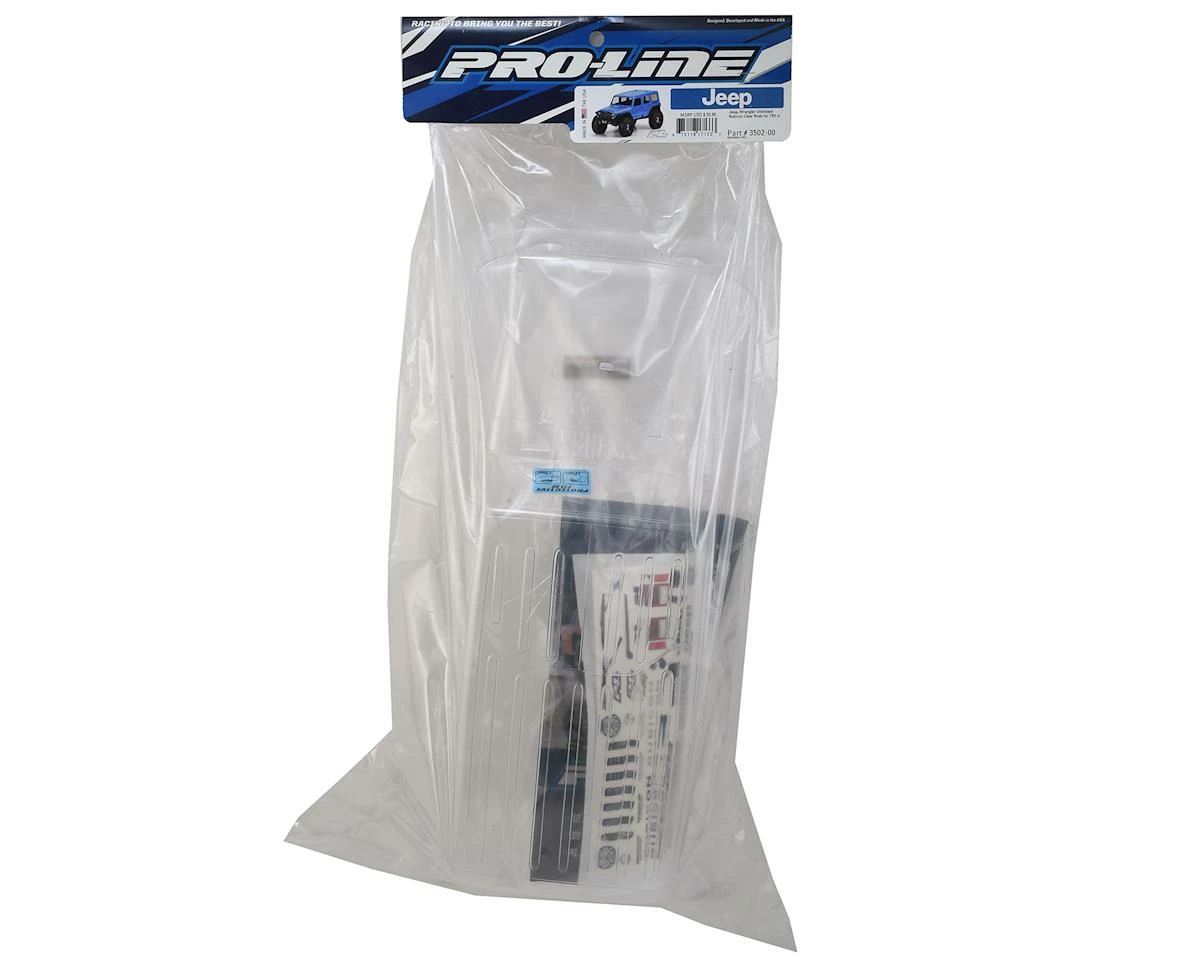 The Pro-Line Jeep Wrangler Unlimited Rubicon Body will completely transform your TRX-4 into an Ultra Scale modern Jeep Rig perfect for Rock Crawling. The details from the full-size Jeep® Wrangler Rubicon have been faithfully recreated and feature a few molded in full-size style upgrade parts like rock sliders and tube fenders. This Pro-Line body is much lighter than the stock TRX-4® body for lower center of gravity and improved crawling performance. The Jeep® Unlimited Rubicon body also features improved clearance front and rear allowing you to tuck in the bumpers for massively improved approach and descent angles to get you up and over obstacles easier than ever before! Window masks, Paint-then-peel overspray film and fully licensed detailed stickers are included to finish off the look.