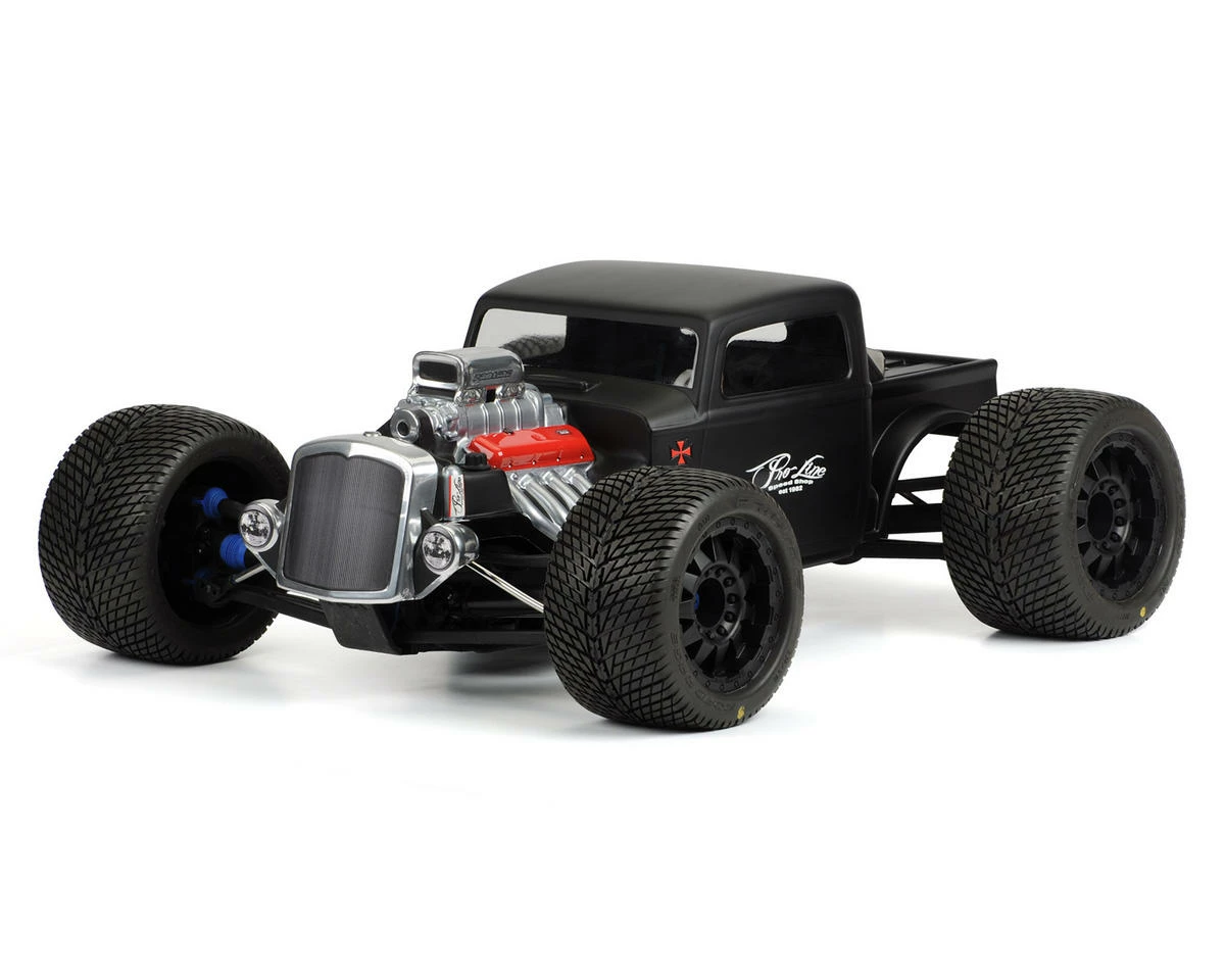 Pro-Line is bringing the old-school custom craze to the RC world with a Rat Rod for your REVO® 3.3, E-REVO® and Summit® trucks! Pro-Line’s Rat Rod body creation was first released for the 1:16 E-REVO class and was featured on one of the most viewed YouTube videos in Pro-Line history. Pro-Line wanted to improve on the design and provide a low profile hard top Roadster with a large front grill and round head lights – perfect for impressing your friends.