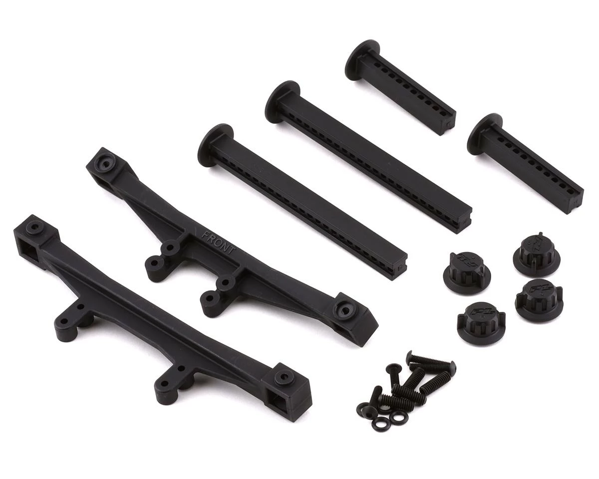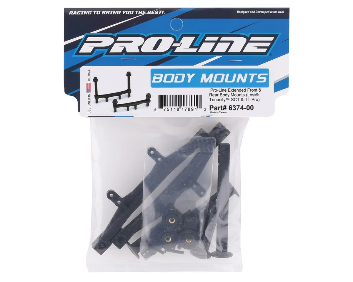 Pro-Line Tenacity SCT/TT Pro Extended Front and Rear Body Mounts. These optional body mounts are intended for the Losi Tenacity SCT or TT Pro. Using these mounts will allow for a fully adjustable body mounts needed for aftermarket body fitment. Featuring screw on body mounts to make sure your body does not fall off during a driving session. Package includes one front and one rear body mount set.
