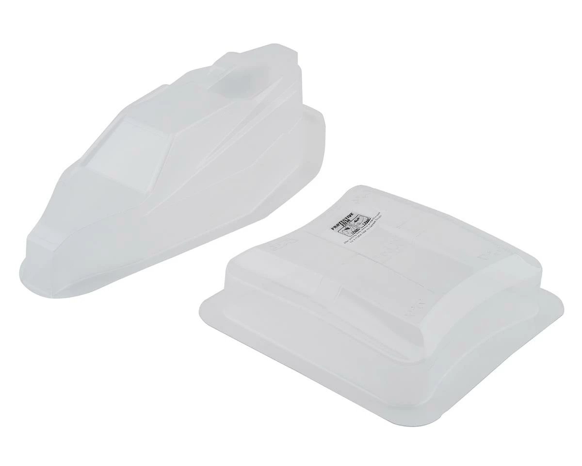 The Pro-Line Lightweight Clear TLR 22 5.0 Axis 2WD 1/10 Buggy Body is part of a redesigned Axis series of bodies for 1/10 scale buggies. This body was designed using the latest CAD technology and features a super low-slung design with sharp lines throughout giving it a recognizable and eye-catching appearance. The cab-forward design provides enhanced steering response while the small side fins balances out the rear of the car with ideal side-bite. The rear of the Axis body has the right amount of clearance for the gearbox and fits the chassis and bulkhead shape of your race buggy perfectly.
