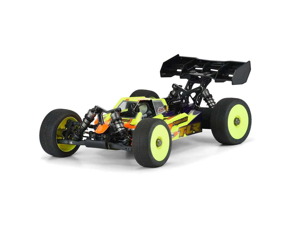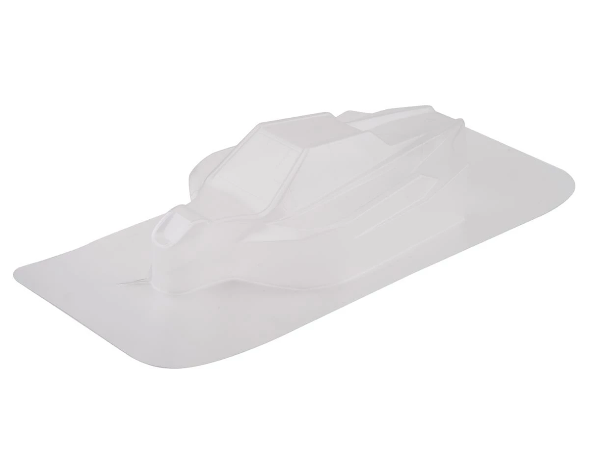 This is a Pro-Line Clear TLR 8ight-X Axis Body. Designed with the latest in CAD technology, the Axis features a super low-slung design with sharp lines throughout giving it an unmistakable look on the track. The Axis is a cab-forward design that provides enhanced steering response while the small side fins balance out the rear of the car with ideal side-bite. The rear of the Axis body has the right amount of clearance for the nitro engine and fits the chassis and bulkhead shape of your race buggy perfectly.