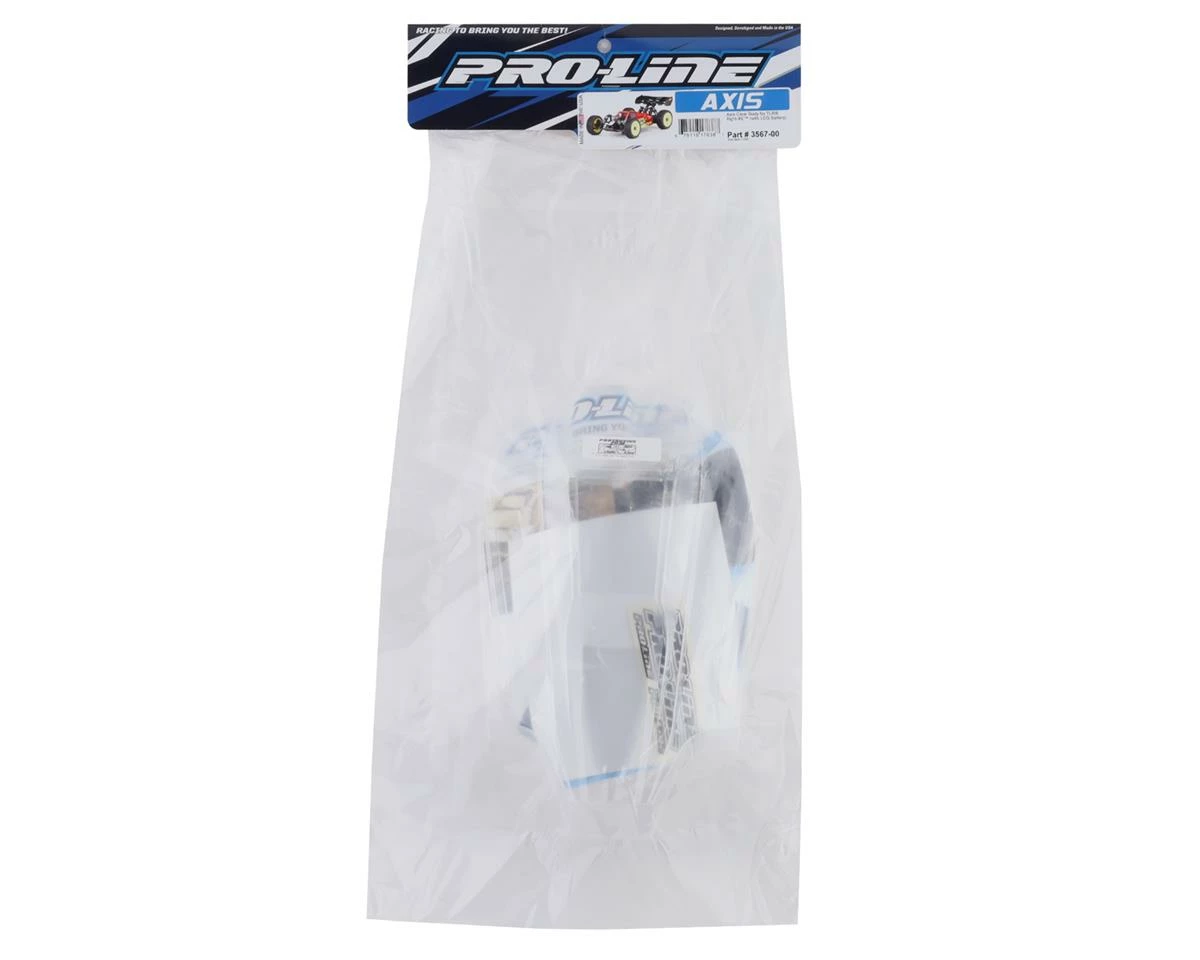 The Pro-Line TLR 8ight-XE Axis 1/8 Electric Buggy Body was designed using the latest in CAD technology, and features a super low-slung design with sharp lines throughout giving it an unmistakable look on the track. The Axis is a cab-forward design that provides enhanced steering response while the small side fins balance out the rear of the car with ideal side-bite. The rear of the Axis body has the right amount of clearance for the motor and electronics and fits the chassis and bulkhead shape of your race buggy perfectly. To run the Axis body on the 8ight-XE electric buggy, the battery must be no taller than 39mm due to the low-slung nature of the Axis side pods.