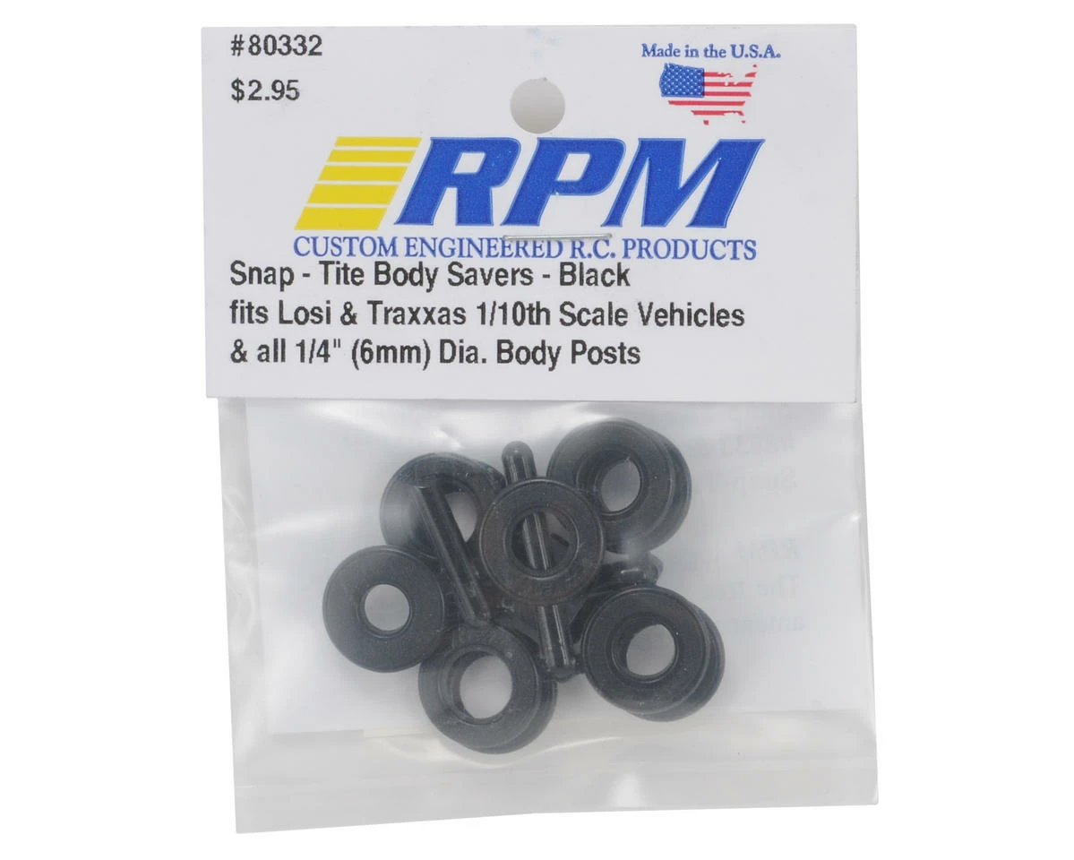 This is a set of five optional RPM Snap-Tite Body Savers, and are intended for use with any vehicle that uses 1/4″ body posts. One of the weakest points on a Lexan body is where the body mounts to the chassis. The holes put in the body for the body posts have a tendency to crack & fracture. This is the reason RPM designed these cool body savers. With their ideal two piece design, it allows one piece to slide through the bottom of the body while the second piece snaps into place from the top of the body. These body savers stay right where you put them, on the body, so you never have to worry about chasing them around! RPM has found that body life tends to triple when they are installed! Molded from black nylon and sold in a set of five, four for the body mounts & one for the antenna hole!