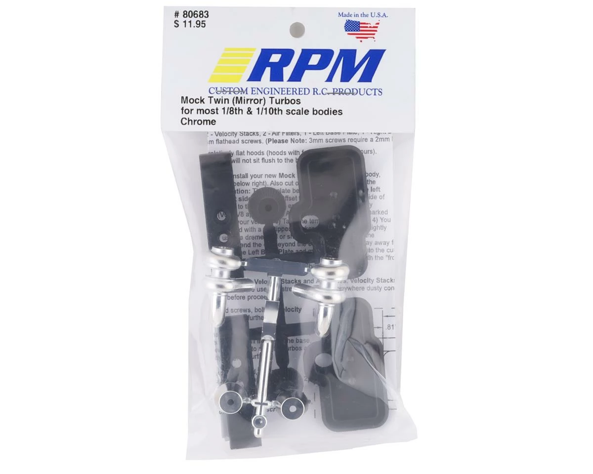 Now you can show off a mirror turbo system in your favorite 1/8 – 1/12 scale ride with a pair of RPM Mirror Turbos prominently perched on your hood. These turbos have a cool, recessed design yet protrude out of the hood far enough to show the detail that makes them unmistakable as anything other than turbos.