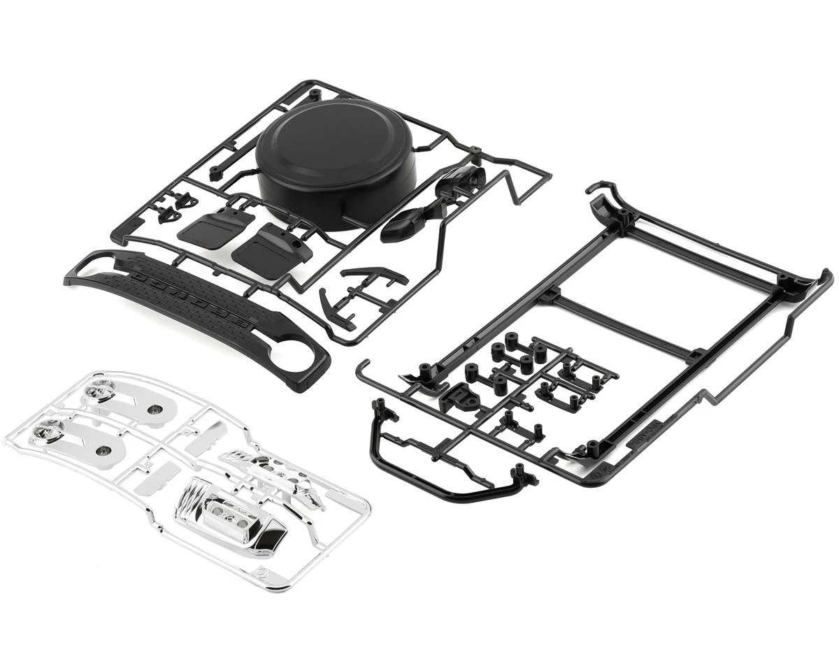 - Separate PC-ABS H parts depict grille, mirrors, spare tire cover and door handles, and metal-plated K parts with light cases.
