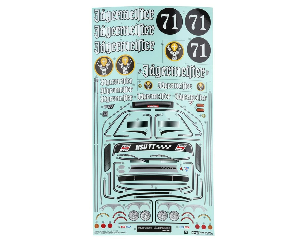 The Tamiya NSU TT Jagermeister Body Set is a complete spare body parts set of the NSU TT Jägermeister. The set includes the team livery sticker set, window masking tape, and plastic side mirrors.
