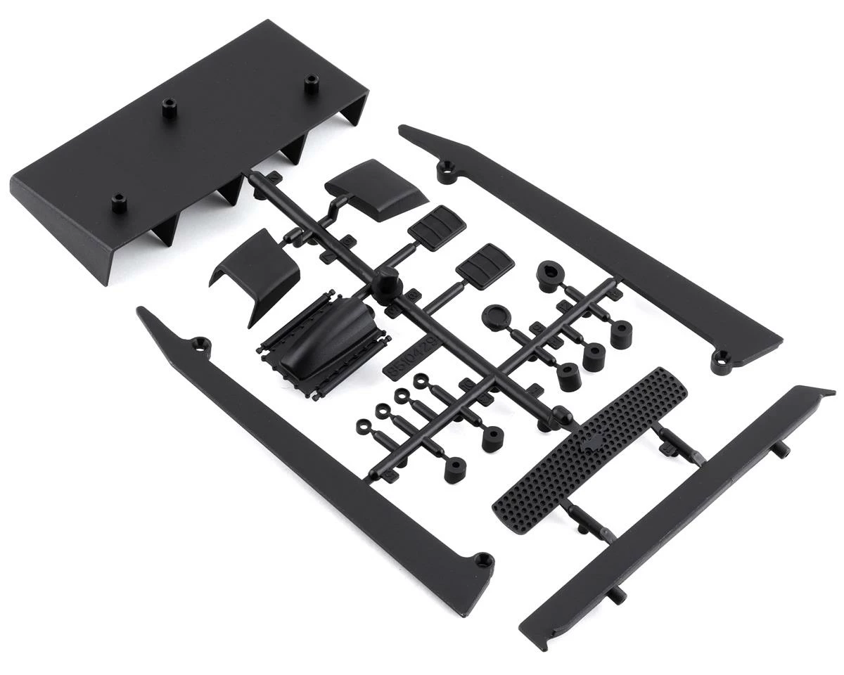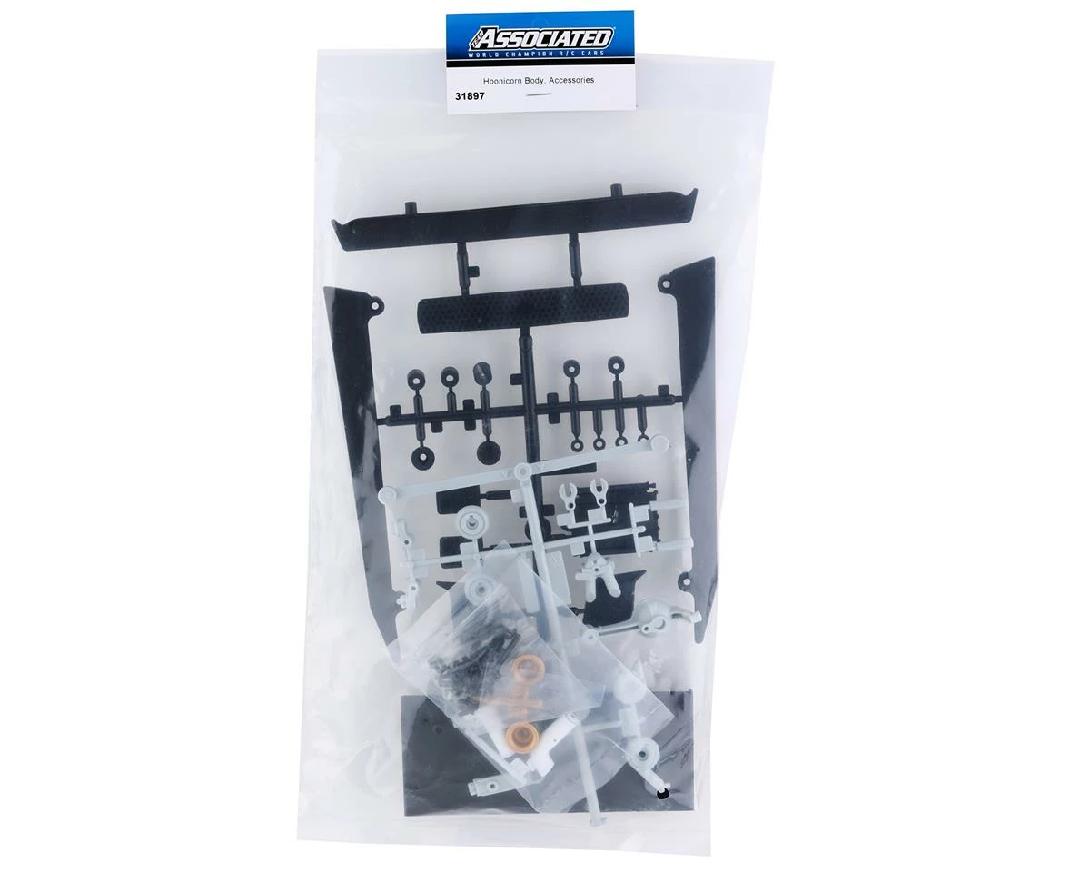 Team Associated Apex2 Hoonicorn Body Accessories. These body accessories are intended as a replacement for the Apex2 Hoonicorn Touring car. Package includes all plastic scale accessories including side skirts, rear diffuser, faux turbos, grille, mounting hardware and more.